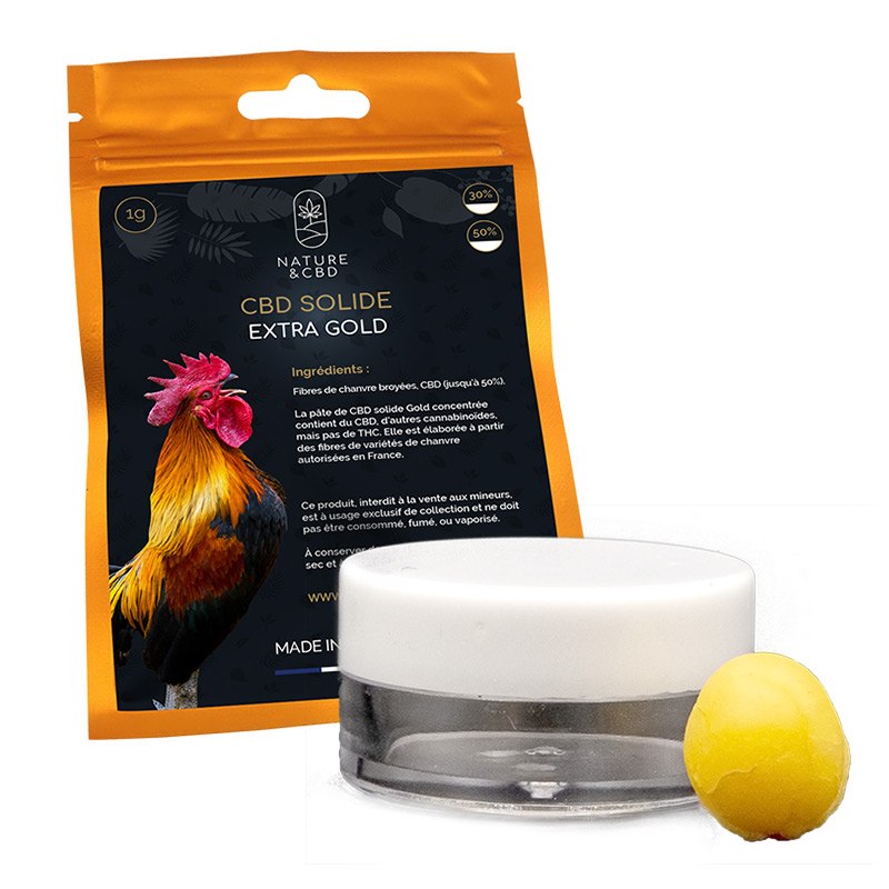 La pâte de CBD solide Gold contient des fibres de chanvre broyées et du CBD (30 et 50%). Sans ajout de terpènes, ce solide au CBD se rapproche au plus près de la nature de la plante. Garanti sans THC, ce produit est uniquement destiné à la collection.